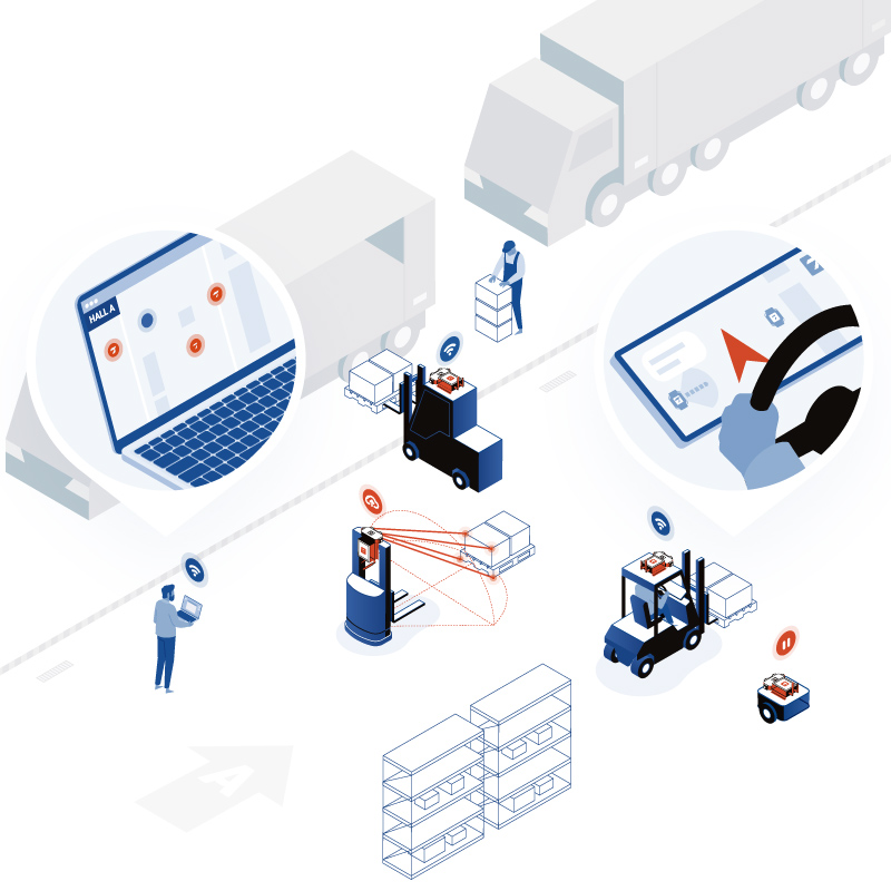 VDA5050に準拠しており、取得した位置情報は倉庫管理システム(WMS)やフリート管理システム(FMS)へと連携できます。走行ルートやトラフィックの解析による運用の効率化、衝突回避や危険警告による安全性向上、スピード、距離などのデジタル管理による予知保全など様々な用途へ活用できる可能性があり、構内物流業務に革新をもたらします。