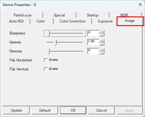 シャープネス、ガンマ、ノイズ除去、反転処理(水平・垂直)の有効/無効を制御。