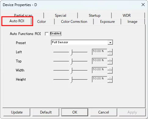 // auto functions ROI preset mode 0:Full Sensor, 1:Custom Rectangle, 2:Center 50 %, 3:Center 25 %, 4:Bottom Half, 5:Top Half