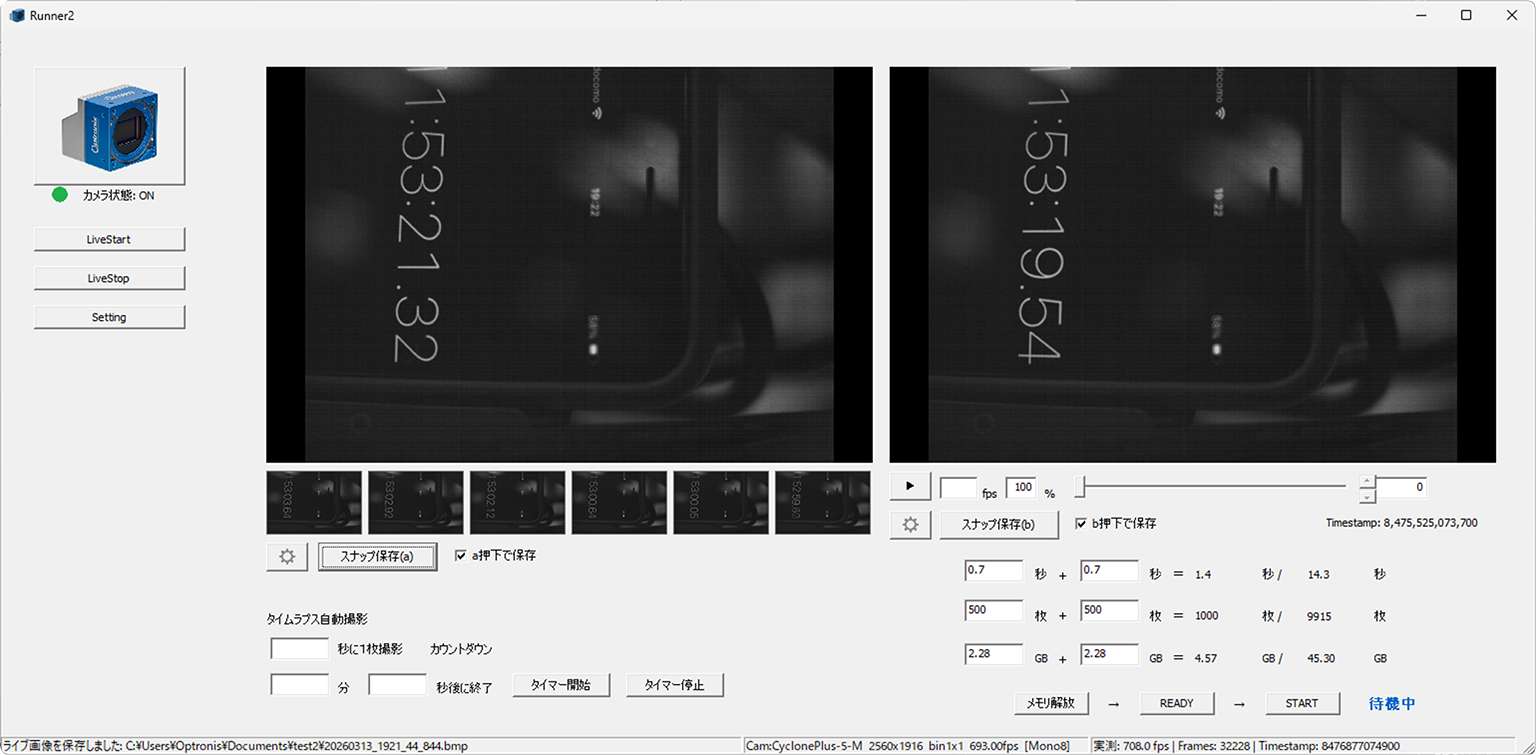Runner2は、Optronis社の新しくなったCXPハイスピードカメラCyclonePlusシリーズを、PC構成を含めて手軽に導入できるCoaXPress高速レコーディングシステムです。メモリーレコーディング機能やプレポストトリガー機能、タイプラプス自動撮影機能が搭載されたRunner2ソフトウェアが付属します。5V TTL信号の外部トリガーをPCシステムに搭載のフレームグラバーのPinに入力する事で、録画の開始ができます。