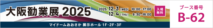 12月3日より2日間、マイドームおおさかにて開催される「大阪勧業展2025」に出展いたします。ご多忙中とは存じますが、ぜひご来場いただき、弊社ブース(ブース番号:B-62)へお立ち寄りくださいますよう、よろしくお願い申し上げます。