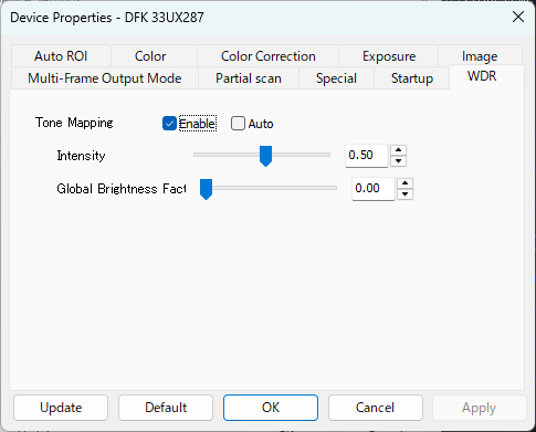 トーンマッピングの有効化、強度、グローバル輝度調整などを設定。