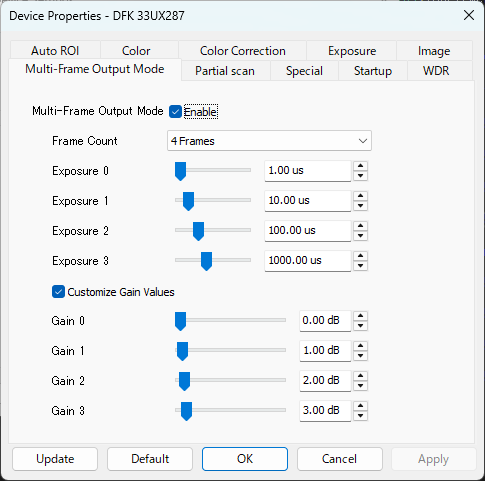 マルチフレーム出力モードを有効化しています。異なる露光時間(Exposure0~3)とゲイン(Gain0~3)を適用した複数のフレームを連続して撮影する機能です。
